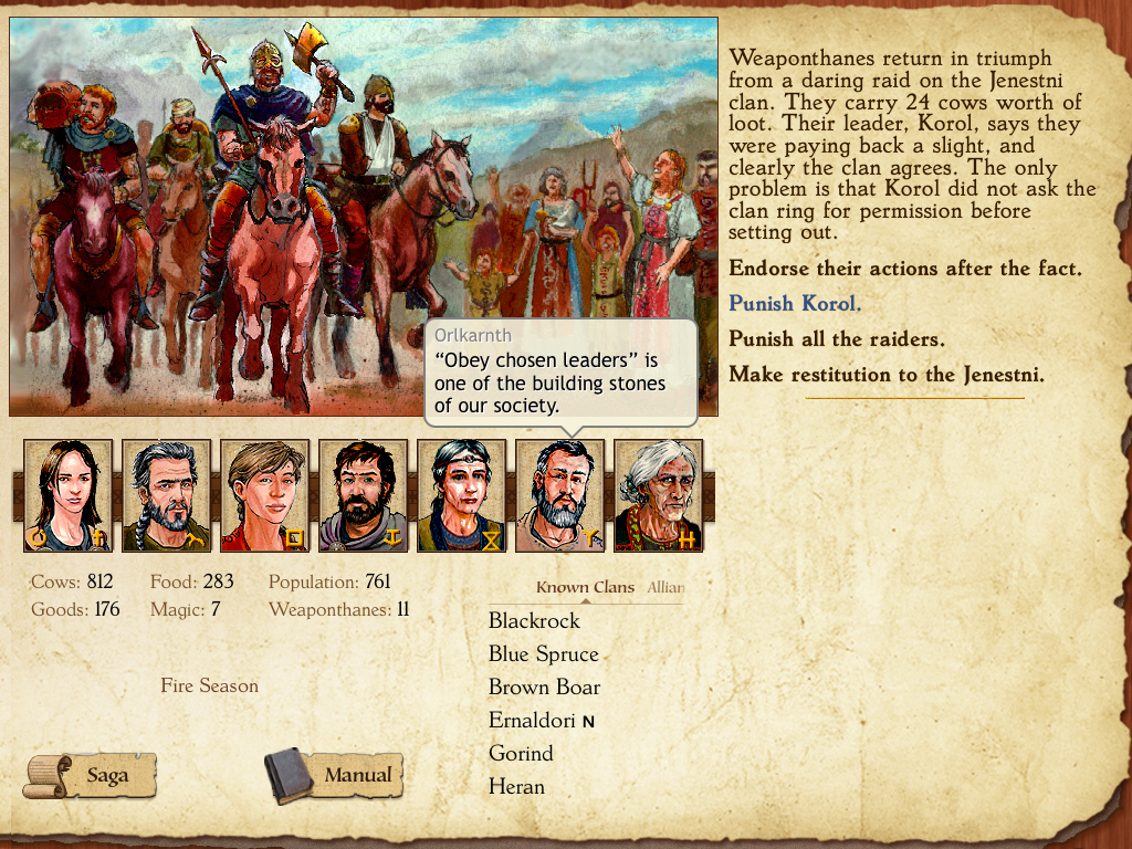 The Relations screen shows your standing with the other clans of Dragon Pass. |